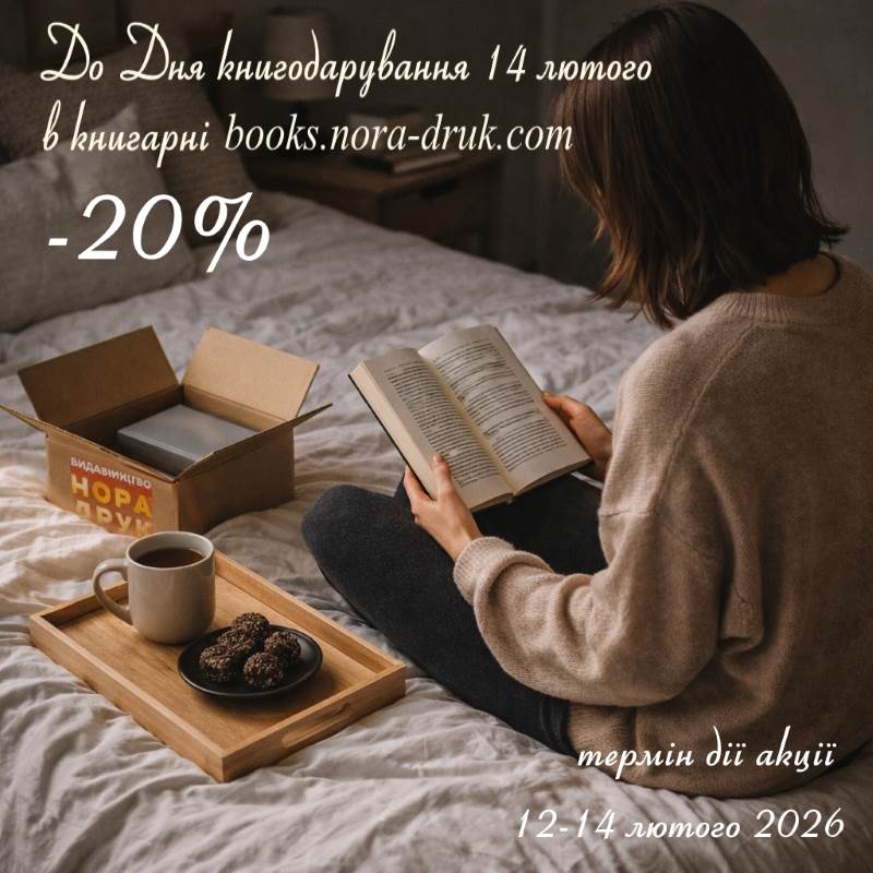 До міжнародного Дня книгодарування 14 лютого оголошуємо Акцію зі знижкою 20%! Знижка розповсюджується на всі книжки в інтернет-книгарні https://books.nora-druk.com/ , окрім тих, які включені в інші акційні пропозиції. Час дії Акції 12-14 лютого 2026 р. Для отримання знижки потрібно при оформленні кошика ввести код купона на знижку 140226 у відповідне поле