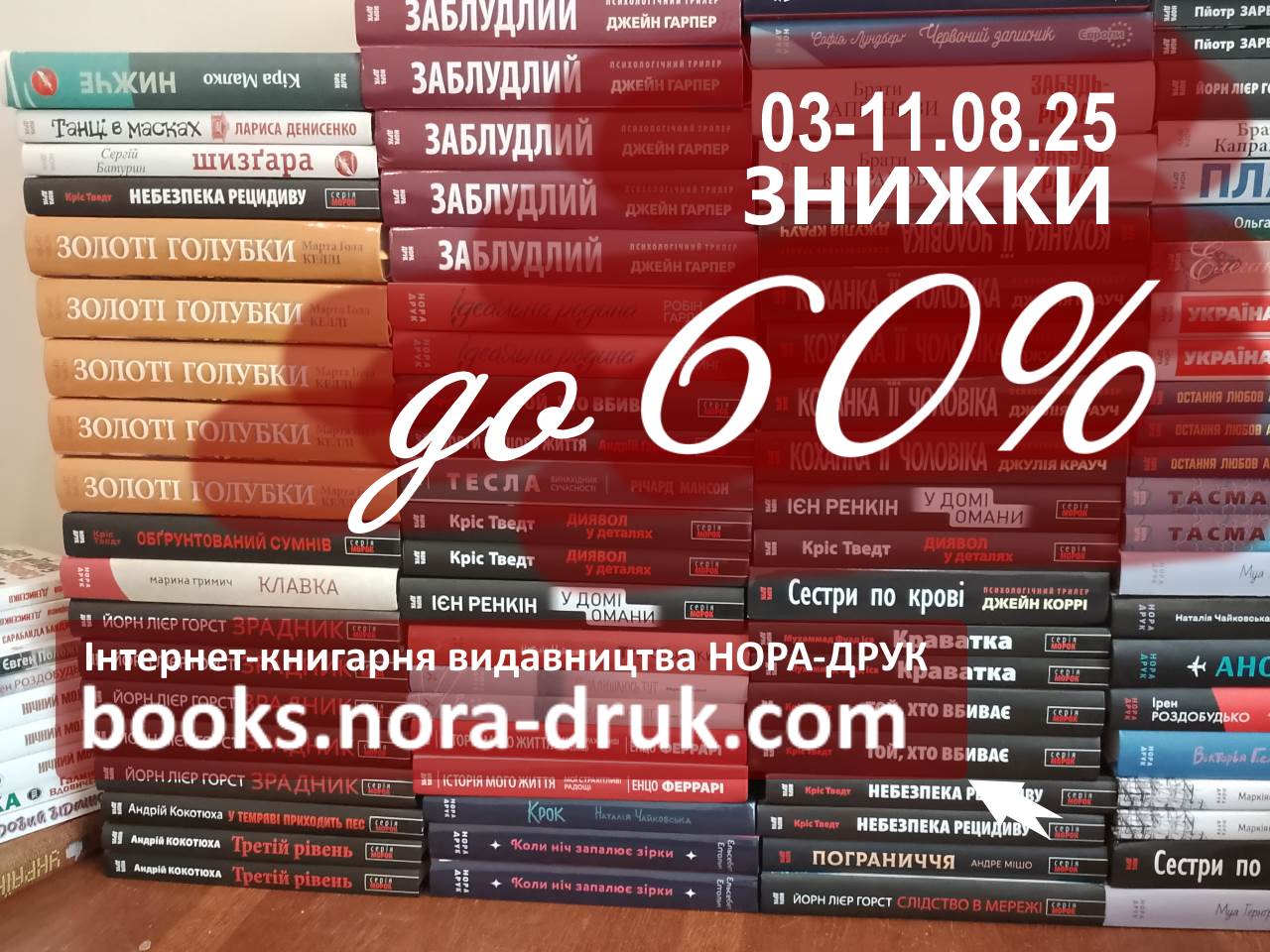 В нашій інтернет-книгарні увесь поточний тиждень діє акція до -60% на всі паперові книжки, включно з примірниками з поверненнями від інших книгарень та з виставок. Заходьте, будь ласка, за посиланням https://books.nora-druk.com/shop/