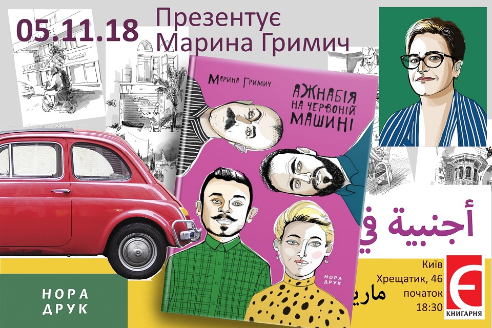 Книгарня «Є» та видавництво «НОРА-ДРУК» запрошують 05 листопада 2018 на творчу зустріч з Мариною Гримич з нагоди виходу в світ її книжки «Ажнабія на червоній машині».