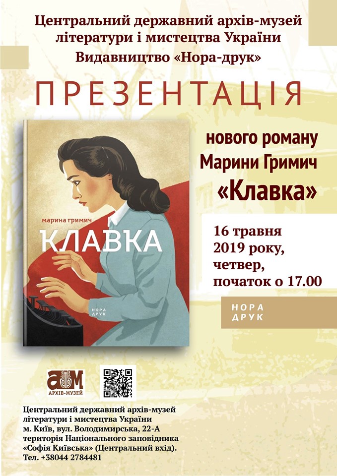 Центральний державний архів-музей літератури і мистецтв України та видавництво “НОРА-ДРУК” запрошують 16 травня 2019 р. на презентацію нового роману Марини Гримич “Клавка”. Початок о 17:00.