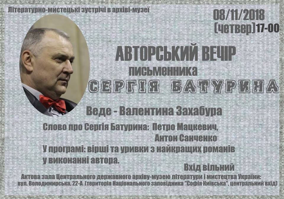 Запрошуємо 8 листопада на творчий вечір письменника Сергія Батурина, який відбудеться в Центральному архіві-музеї літератури і мистецтв України (вул. Володимирська,22а). Початок о 17:00. Вхід вільний