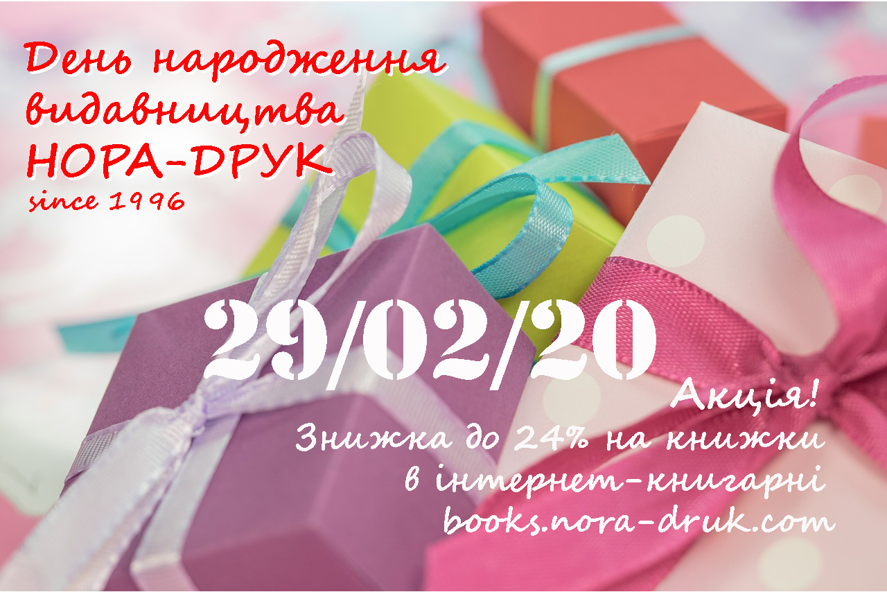До дня народження видавництва “НОРА-ДРУК” 29 лютого 2020знижка до 24% на всі паперові книжки в нашій інтернет-книгарні! Акція діє до 29.02.20 включно. З повним переліком акційних книжок та знижками можна ознайомитися на сторінці Спеціальна пропозиція! Кількість книжок обмежена. Обробка замовлень розпочнеться з 02.03.20.