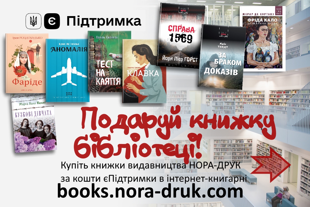 Якщо Ви маєте бажання подарувату ту або іншу книжку Видавництва “НОРА-ДРУК” для поповнення бібліотечних фондів і витратити на це гроші з єПідтримки, то Інтернет-книгарня видавництва Нора-Друк допоможе в цьому! Вкажіть при оформленні замовлення в полі “Примітки до замовлень” які саме книжки Ви бажаєте передати в бібліотеку і ми виконаємо Ваше побажання!