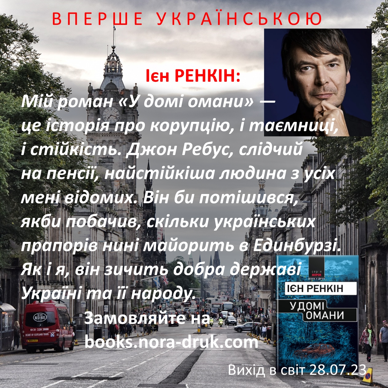 «Я страшенно щасливий, що читачі в Україні зможуть провести трохи часу в Шотландії — й зокрема в Единбурзі, — нехай і лише через літературний твір. Мій роман «У домі омани» — це історія про корупцію, і таємниці, і стійкість. Джон Ребус, слідчий на пенсії, найстійкіша людина з усіх мені відомих. Він би потішився, якби побачив, скільки українських прапорів нині майорить в Единбурзі. Як і я, він зичить добра державі Україні та її народу. Можливо, історія, дія якої відбувається в Шотландії, допоможе читачам на кілька годин утекти від їхньої реальності й покаже інший світ — світ чоловіка, що ніколи не здається, чоловіка, що завжди на боці справедливості й невинних. У світі, який часто здається створеним з омани і брехні, правда знаходить спосіб прорватися на поверхню — і в романах, і не тільки.»